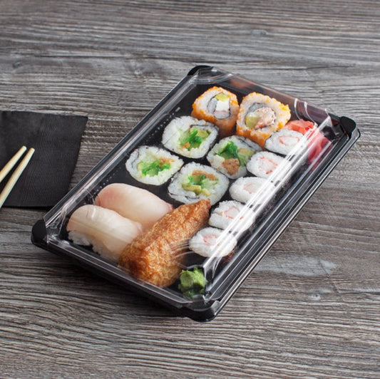 Sushi Container with 6 packs by 100 Sushi Container Trays with Lids - 600/case [500EPSH3CBK]